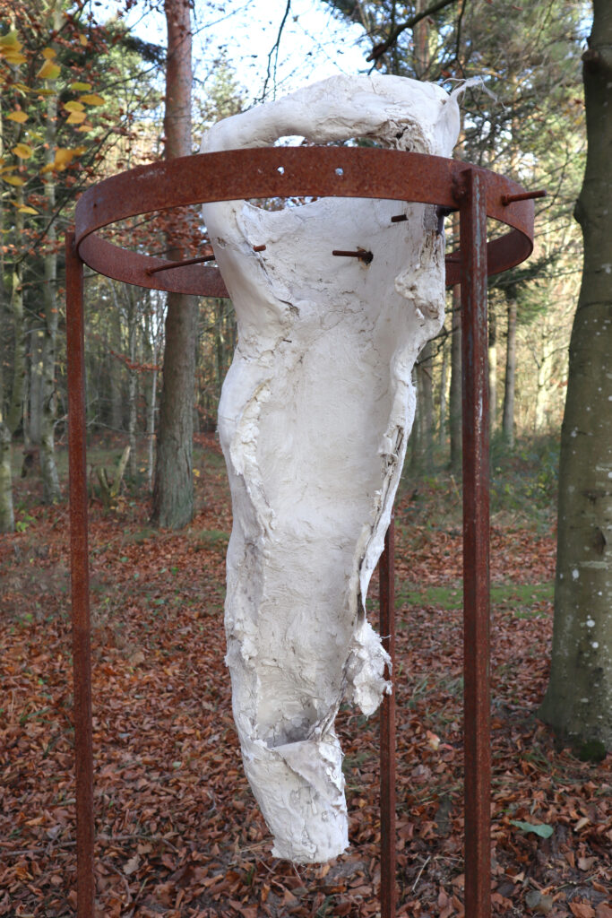 In a construction of iron, an object is supported or held in place. This object is made of plaster and textile materials we recognize. Each of these objects carries a story of a feeling or a state of being.